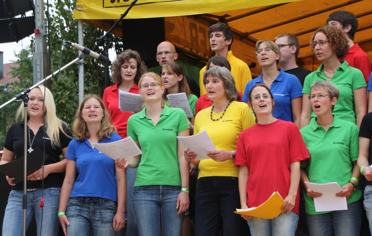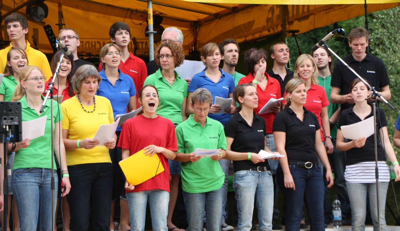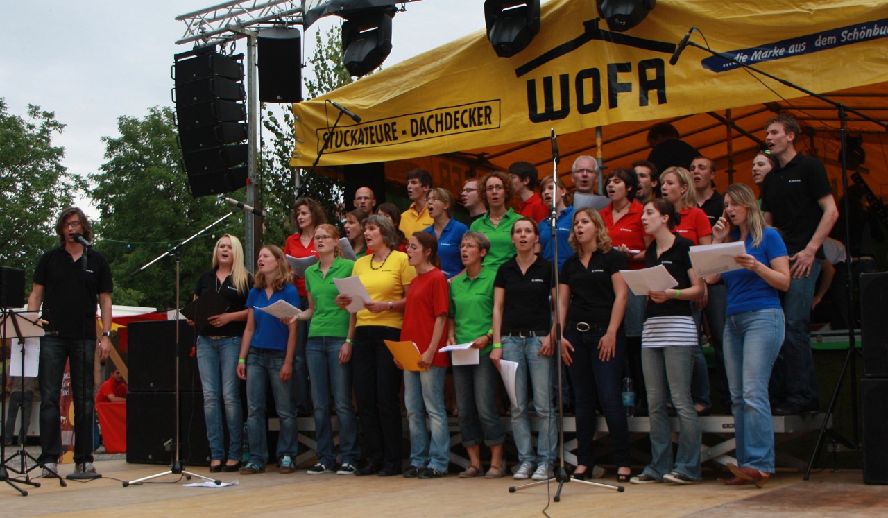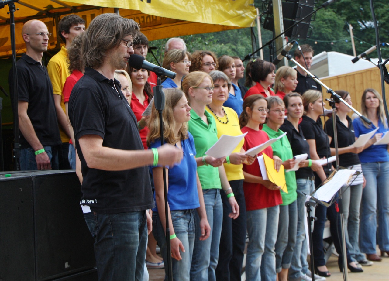 Nachdem wir im letzten Jahr ganz kurzfristig wegen einer Beerdigung im hohen Norden absagen mußten, waren wir dieses Jahr wieder voll dabei. Voll heißt konkret: mit fast 30 Leuten! Das klang gut, so hat man uns hinterher gesagt ;-). Auch deswegen, weil wir im Rahmen der XL-Aktion durch 10 wackere Mitstreiter-Innen zu dieser beachtlichen Anzahl gekommen waren! Vielen Dank an alle, die sich fast zwei Monate jetzt intensiv auf den Auftritt vorbereitet haben, auch an Michael, Simon, Holger, Jeremias und Maxi, die den ganzen Technik-Kram vorher geschaukelt haben. Und an die "Grafenberger", die in diesem Jahr so freundlich waren, uns über ihre Anlage mitzuverstärken. Das gab die Extra-Portion Schalldruck, die man auf diem großen Platz am See gut gebrauchen kann ;-)))